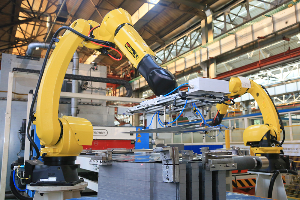 在參觀哈電集團電機公司沖剪數(shù)字化車間時,記者看到有很多黃色機身的機器人飛快地在不同流水線上有序工作。它們的上崗保證了自動上下料、沖片缺陷檢測、廢料壓塊等工藝的順暢進(jìn)行。“這些智能化操作使我們車間工人減少了三分之二,”工作人員肯定了傳統(tǒng)制造業(yè)“插上數(shù)字化翅膀”后的高效。