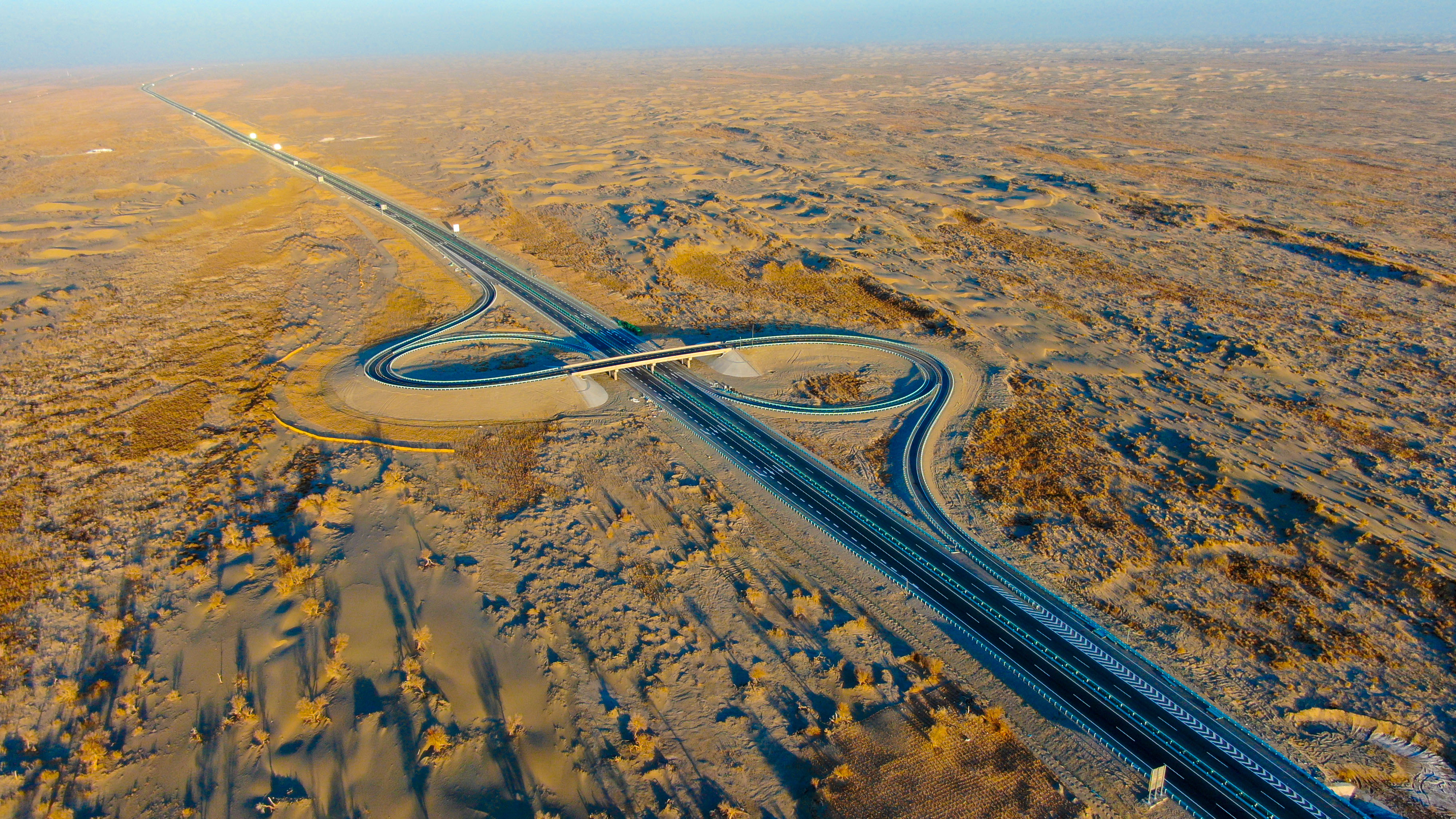 2021年,中國中鐵投資建設運營的新疆若羌至民豐高速公路通車。圖1為若民高速若羌西互通立交。圖2為若民高速最長橋梁車爾臣河大橋。圖3為若民高速阿克塔孜互通匝道橋。
