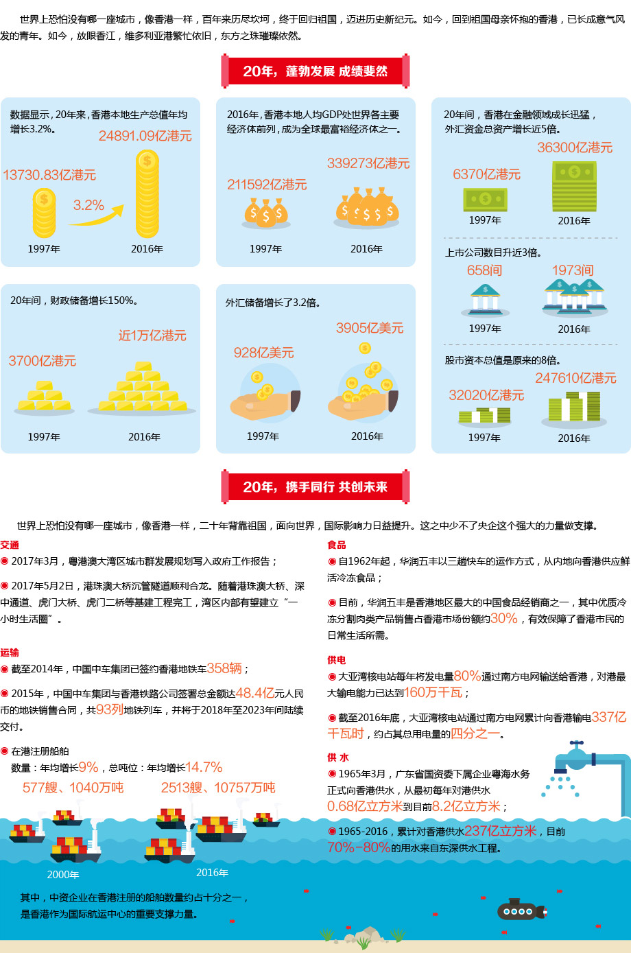 傾聽歷史跫音,回首來時歷程。二十年來,在黨中央的高度關(guān)懷和“一國兩制”方針的正確指引下,香港這顆明珠璀璨奪目,這艘巨輪乘風(fēng)破浪、揚帆前行,實現(xiàn)了經(jīng)濟繁榮、民主發(fā)展和社會全面進步。這些成績?nèi)〉玫谋澈蠖茧x不開一個強大的名字——中央企業(yè)。從珠港澳大橋,粵港澳大灣區(qū),到與百姓息息相關(guān)的水、電、天然氣……無論是國家戰(zhàn)略,還是民生保障,央企與香港始終戮力同心,共創(chuàng)繁榮。