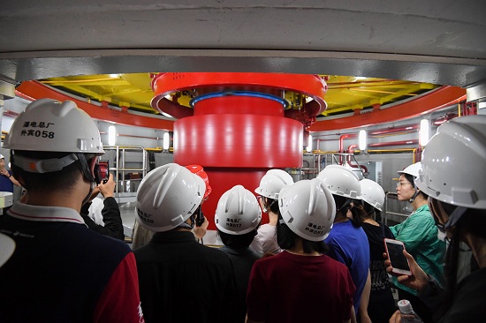媒體記者在參觀國家能源集團大渡河瀑布溝水電站的一處水輪發電機連接軸(9月21日攝)。