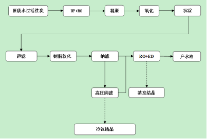 焦化廢水零排放資源化利用工藝包含三大部分:預處理部分,膜濃縮分鹽部分和結晶出鹽部分。