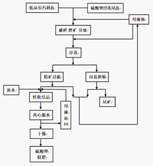 硫酸鉀鎂肥項目的瀉利鹽和硫酸鉀尾鹽混礦入選,經破碎、磨礦分級、浮選、過濾、結晶、離心、擠壓、干燥、破碎篩分、包裝等過程,通過制定工藝指標控制文件,嚴格把控各環節工業參數,從而實現利用生產硫酸鉀廢棄尾礦和瀉利鹽田礦物中丟棄的鉀離子,生產出符合國家標準要求的農業用硫酸鉀鎂肥產品。