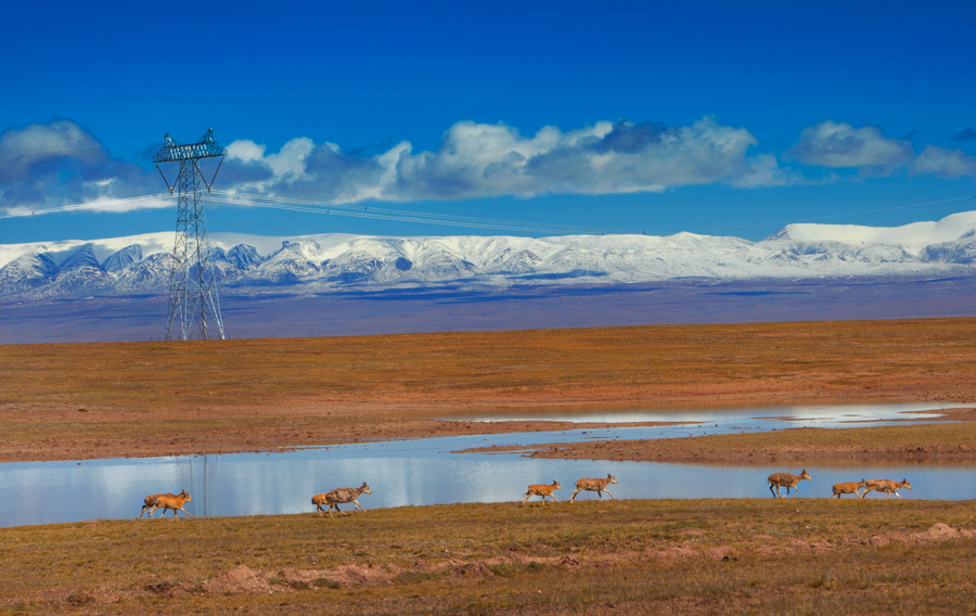 作品說明:照片拍攝于可可西里,里面有雪山、草地、藏羚羊、還有特高壓,照片中的電網為青藏聯網工程,結束了西藏電網孤網運行的歷史,體現出國家電網的社會責任。