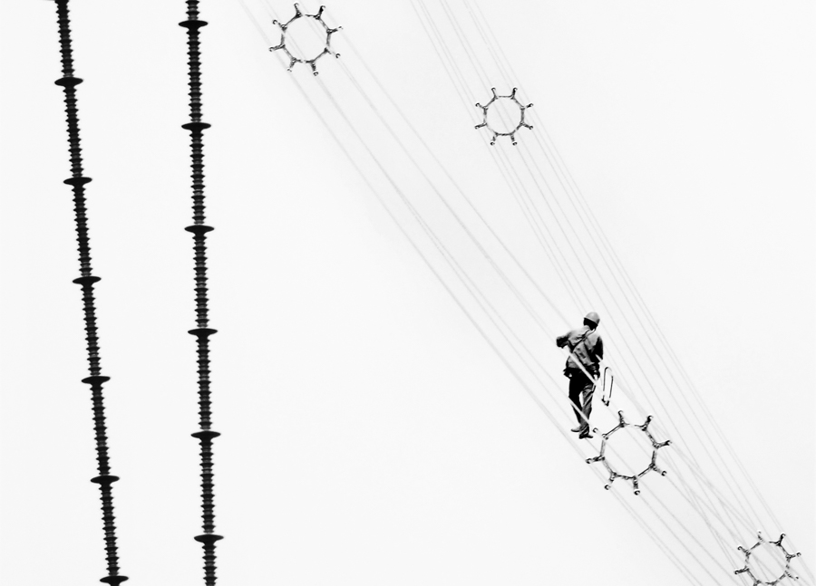 作品說明:2014年9月27日,拍攝于麗水1000KV浙南站,電力工人正在檢查特高壓線路。