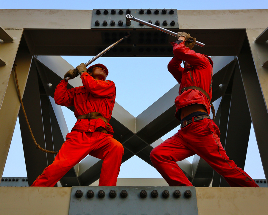 作品說明:2015年1月18日,在港珠澳大橋鋼箱梁建設工地,中鐵山橋集團員工正在擰緊鋼箱梁連接板螺栓。