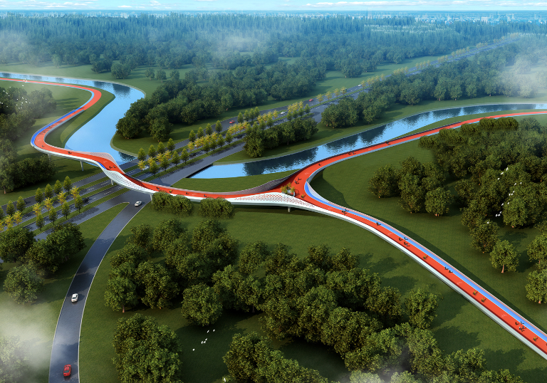 所建橋成形面能滿足舉辦大型國際自行車、馬拉松等大型賽事賽道要求標準,且契合城市慢行交通對舒適性、美觀性、綠色生態發展的理念。